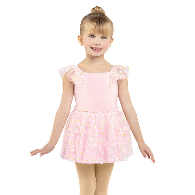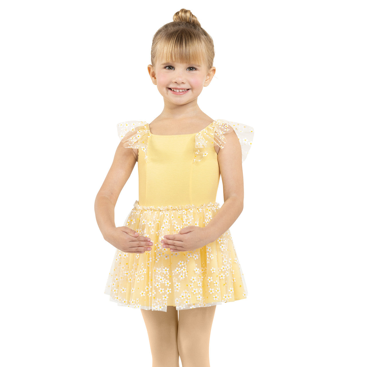 - Attached cotton-spandex skirt under a daisy print tulle top skirt